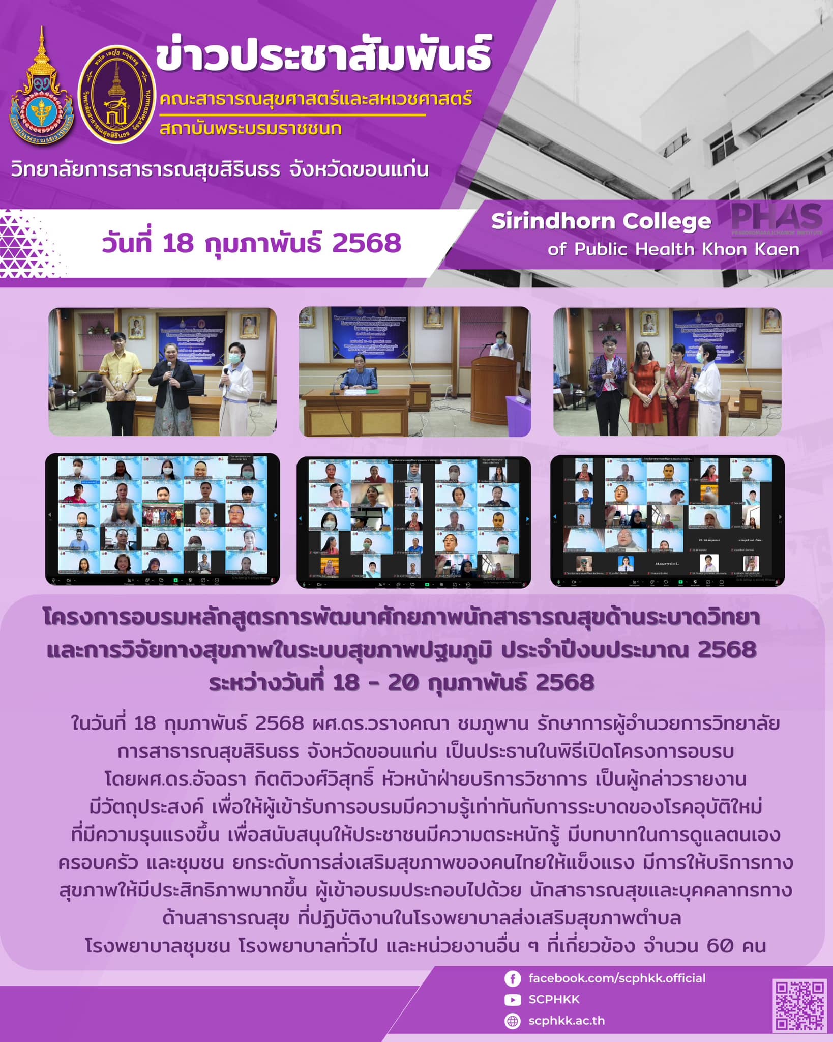 เมื่อวันที่ 18 กุมภาพันธ์ 2568 ผศ.ดร.วรางคณา ชมภูพาน รักษาการผู้อำนวยการวิทยาลัยการสาธารณสุขสิรินธร จังหวัดขอนแก่น เป็นประธานในพิธีเปิดโครงการอบรบ โดยผศ.ดร.อัจฉรา กิตติวงศ์วิสุทธิ์ หัวหน้าฝ่ายบริการวิชาการ เป็นผู้กล่าวรายงาน มีวัตถุประสงค์เพื่อให้ผู้เข้ารับการอบรมมีความรู้เท่าทันกับการระบาดของโรคอุบัติใหม่ที่มีความรุนแรงขึ้น เพื่อสนับสนุนให้ประชาชนมีความตระหนักรู้ มีบทบาทในการดูแลตนเอง ครอบครัว และชุมชน ยกระดับการส่งเสริมสุขภาพของคนไทยให้แข็งแรง มีการให้บริการทางสุขภาพให้มีประสิทธิภาพมากขึ้น ผู้เข้าอบรมประกอบไปด้วย นักสาธารณสุขและบุคคลากรทางด้านสาธารณสุข ที่ปฏิบัติงานในโรงพยาบาลส่งเสริมสุขภาพตำบล โรงพยาบาลชุมชน โรงพยาบาลทั่วไป และหน่วยงานอื่น ๆ ที่เกี่ยวข้อง จำนวน 60 คน