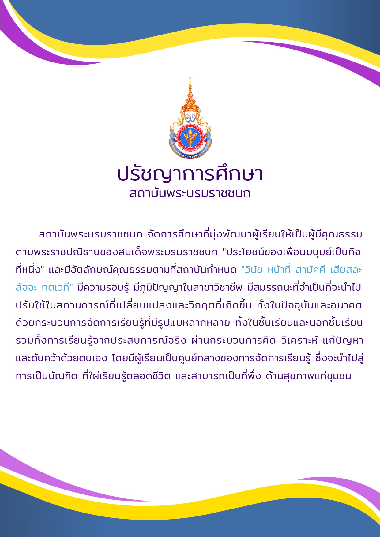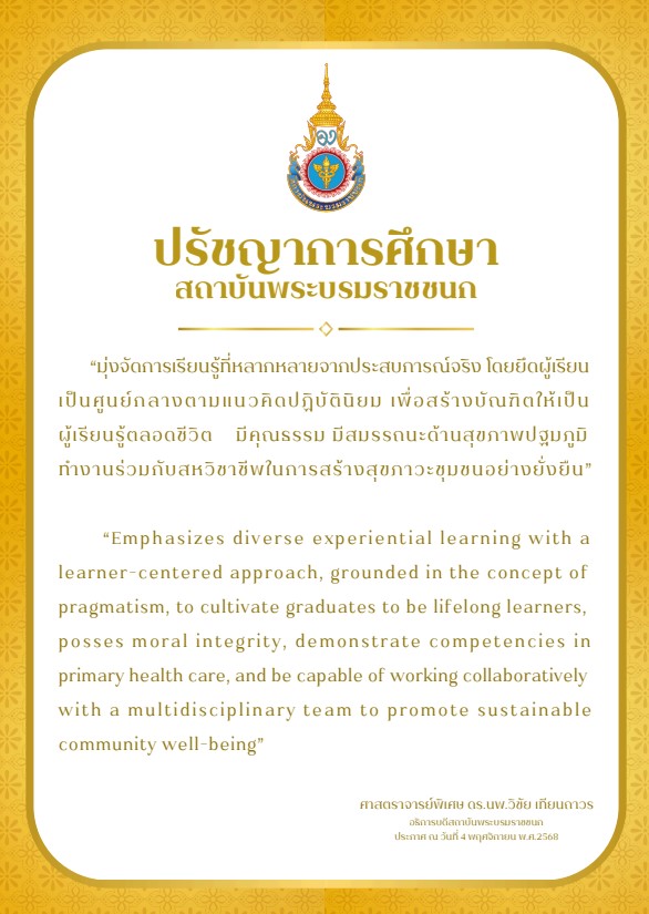 “จัดการศึกษาแบบบูรณาการ ผสานความรู้สู่ชุมชน พัฒนากำลังคนให้มีคุณภาพ เพื่อให้การบริการสุขภาพด้วยหัวใจความเป็นมนุษย์”